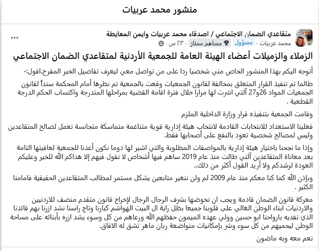 دعا الناشط القانوني وصاحب فكرة ايجاد جمعية مع آخرين والرئيس الاسبق للجمعية الأردنية لمتقاعدي الضمان الاجتماعي محمد عربيات الهيئة العامة للاستعداد للانتخابات القادمة لانتخاب هيئة إدارية جديدة للجمعية ، وجاءت دعوته عبر منشور على صفحة "متقاعدي الضمان الاجتماعي / اصدقاء محمد عربيات وايمن المعايطة" بين توضيحا حول الانتخابات القادمة وأسباب إقامتها.. وتاليا ما نشره عربيات :