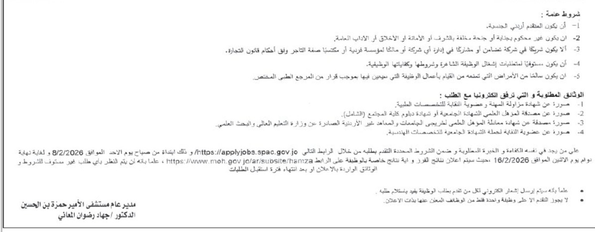 اعلن مستشفى الأمير حمزة، اليوم الثلاثاء، عن حاجته لتعبئة وظائف شاغرة.