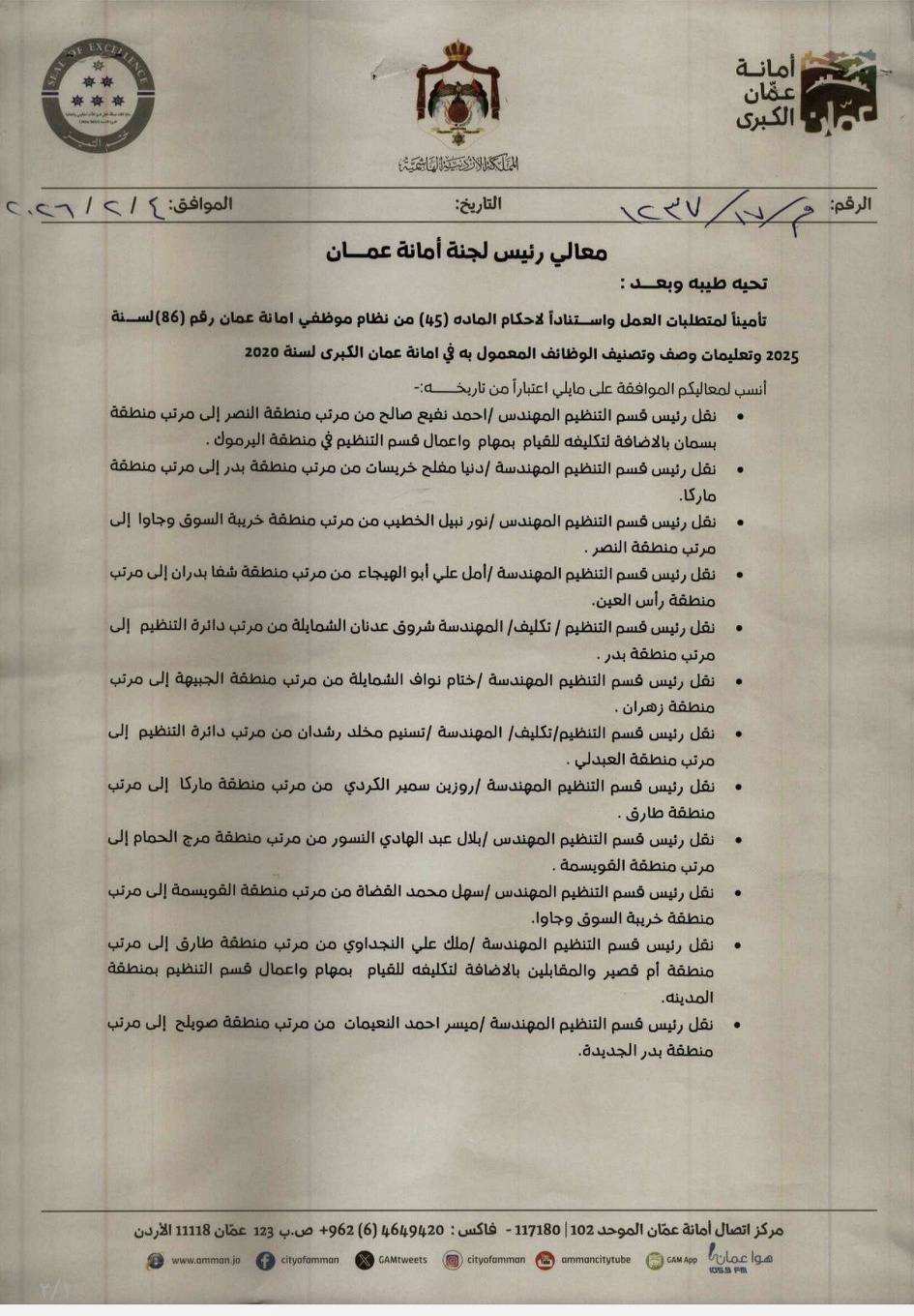 تأمينا لمتطلبات العمل واستنادا لاحكام المادة 45 من نظام موظفي أمانة نعمان رقم 86 لسنة 2025 وتعليمات وصف وتصنيف الوظائف المعمول به في أمانة عمان الكبرى لسنة 2020، قرر رئيس لجنة الأمانة، الدكتور يوسف الشواربة الموافقة على اجراء تنقلاتواسعة.