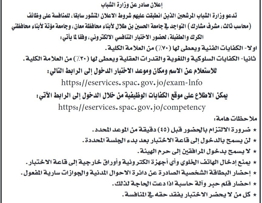 دعت دوائر حكومية، اليوم الخميس المرشحين الذين انطبقت عليهم شروط الاعلان المنشور سابقا للامتحان التنافسي.