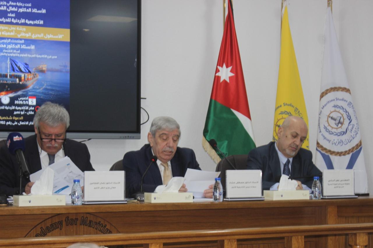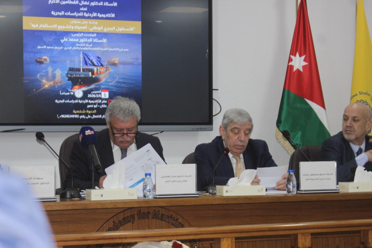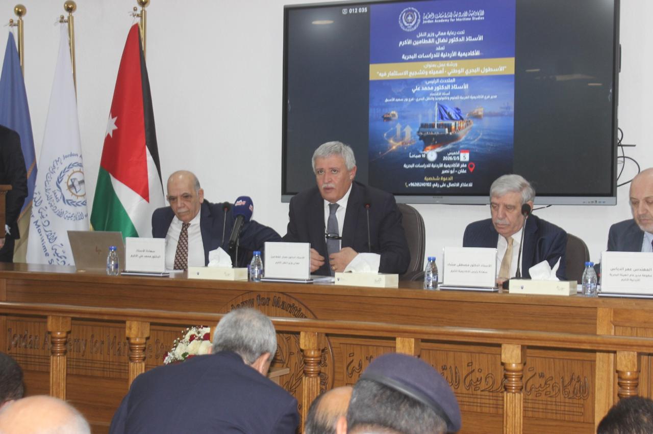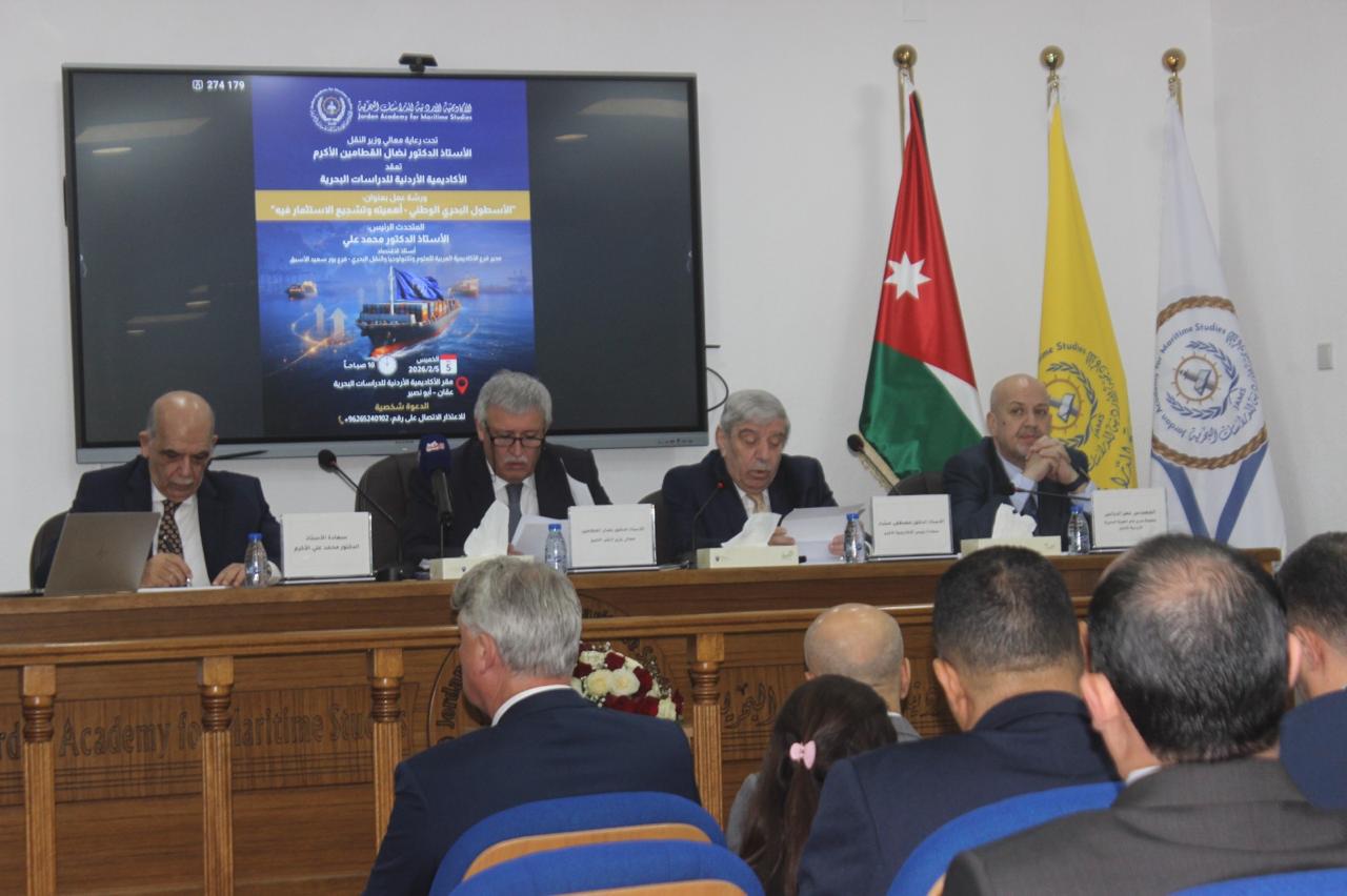 برعاية معالي الأستاذ الدكتور نضال القطامين، وزير النقل الأكرم، نظمت الأكاديمية الأردنية للدراسات البحرية، اليوم الخميس الموافق 5 شباط 2026، ورشة عمل وطنية بعنوان "الأسطول البحري الوطني – أهميته وتشجيع الاستثمار فيه”، وذلك في مقر الأكاديمية وبمشاركة نخبة من صناع القرار والخبراء والمختصين في القطاع البحري والنقل والاقتصاد.