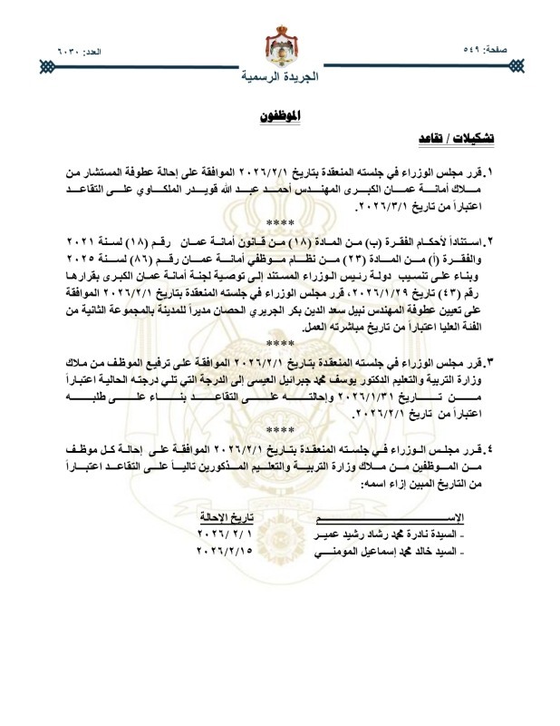 قرر مجلس الوزراء ترفيع موظفين في عدد من الوزارات والدوائر والمؤسسات وإحالات إلى التقاعد