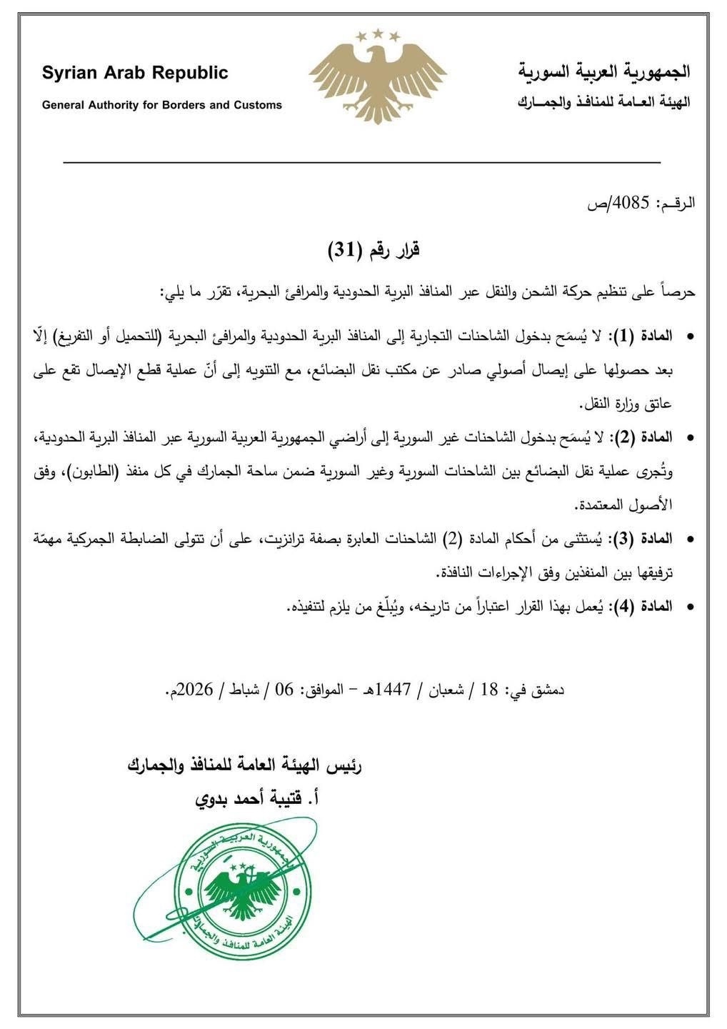 وأشار إلى أن القرار استثنى الشاحنات العابرة للأراضي السورية بصفة ترانزيت على ان تتوالى الضابطة الجمركية مهمة ترفيقها بين المنفذين.