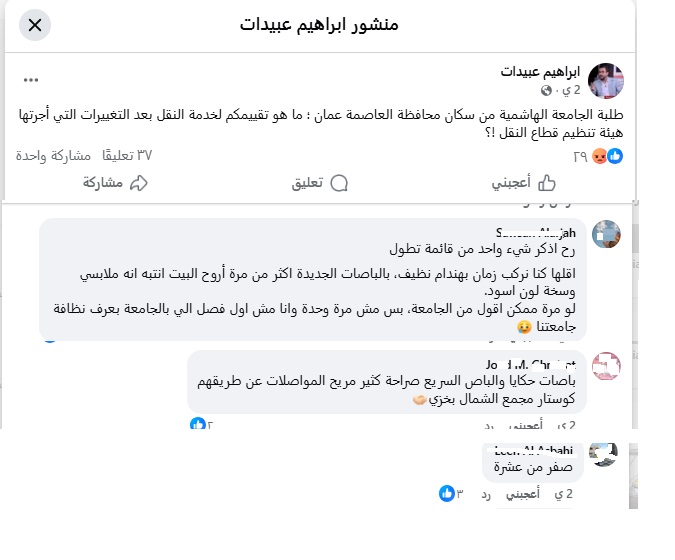 استفتاء على السوشال ميديا.. طلبة الهاشمية :خدمات النقل بعد تحديثات هيئة النقل من سيء لأسوأ وهذه أبرز الردود