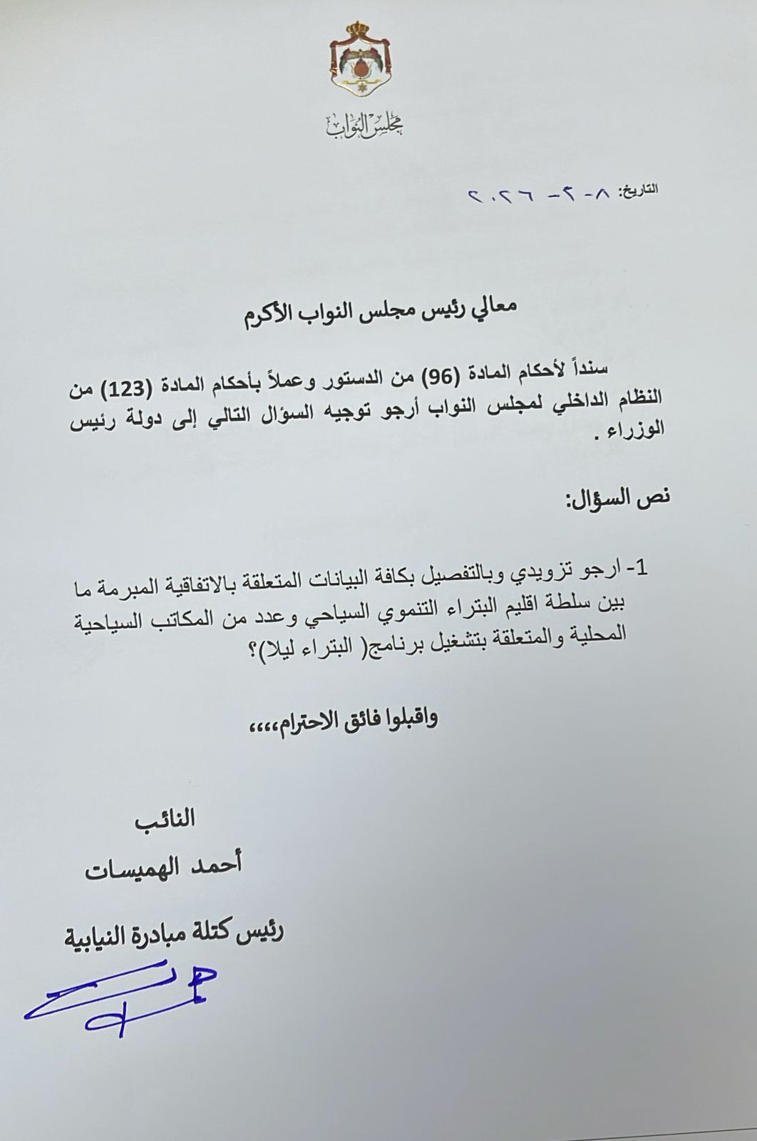 النائب الهميسات يوجه 7 استفسارات خطيرة في سؤال نيابي عن سلطة اقليم البترا  وثيقة