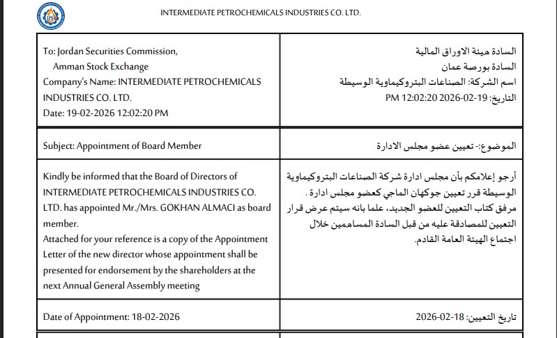 حيث تم نشر عدة افصاحات خاصة بالشركة على موقع بورصة عمان الأول يتعلق باستقالة الرئيس التنفيذي للشركة الدكتور تيسير عامر حيث نشرت الشركة افصاحاً تعلن به هذا الخبر جاء به ارجو اعلامكم بان السيد تيسير موسى عامر والذي يعمل بوظيفة نائب رئيس مجلس الادارة الرئيس التنفيذي لشركة الصناعات البتروكيمياوية الوسيطة قام بتاريخ 18-2 بتقديم استقالة من الشركة اعتبارا من 1-5-2026.