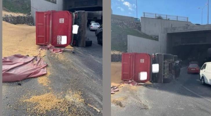 تدهور شاحنة على طريق المطار وانسكاب حمولتها