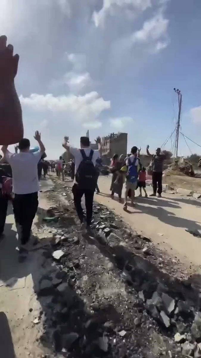 مشهد مؤلم .. اطفال نازحون يرفعون مناديل بيضاء خشية قصفهم من قبل القوات الصهيونية التي تمكنت من تحقيق اختراقات في بعض شوارع شمال المدينة