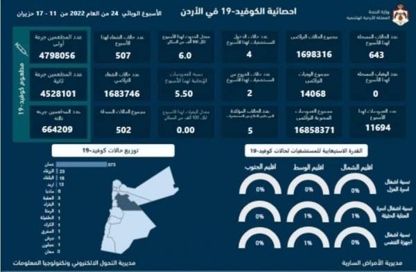تسجبل 643 إصابة بكورونا في الأردن خلال أسبوع