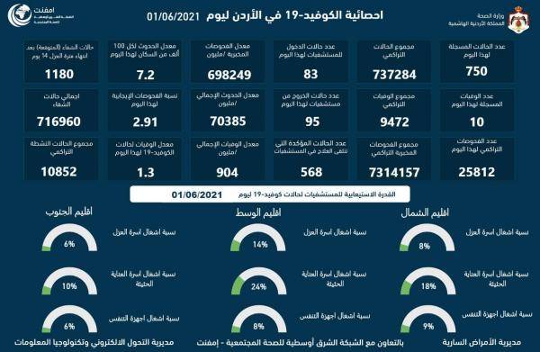 10 وفيات و750 اصابة كورونا جديدة في الاردن