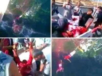مشاهد مروعة تبين قيام المجموعات المسلحة في حماة بسحل جثث قتلى الجيش السوري وإلقائها في نهر العاصي بعد التمثيل بهم بالصور والفيديو