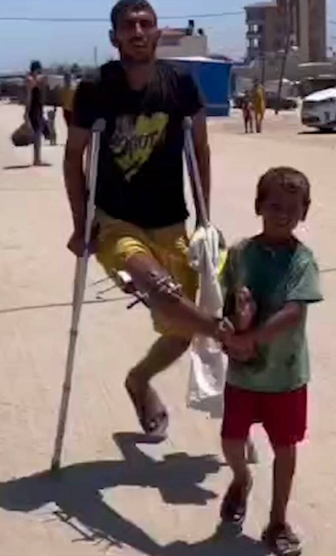 طفل يحمل قدم أبيه المصاب خلال نزوحهم جنوب قطاع غزة .. فيديو