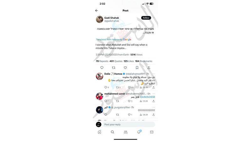 حساب اسرائيلي ينشر معلومة استهداف طابا المصرية قبل يوم من سقوط طائرة مجهولة الهوية على المدينة