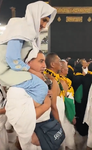 معتمر يحمل والدته على كتفيه ويطوف بها حول الكعبة