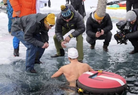 مغامرة خطيرة.. يكتم أنفاسه ويغوص عشرات الأمتار ببحيرة متجمدة