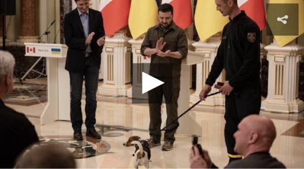 كلب أوكراني يهاجم رئيس وزراء كندا بحضور زيلينسكي! (فيديو)