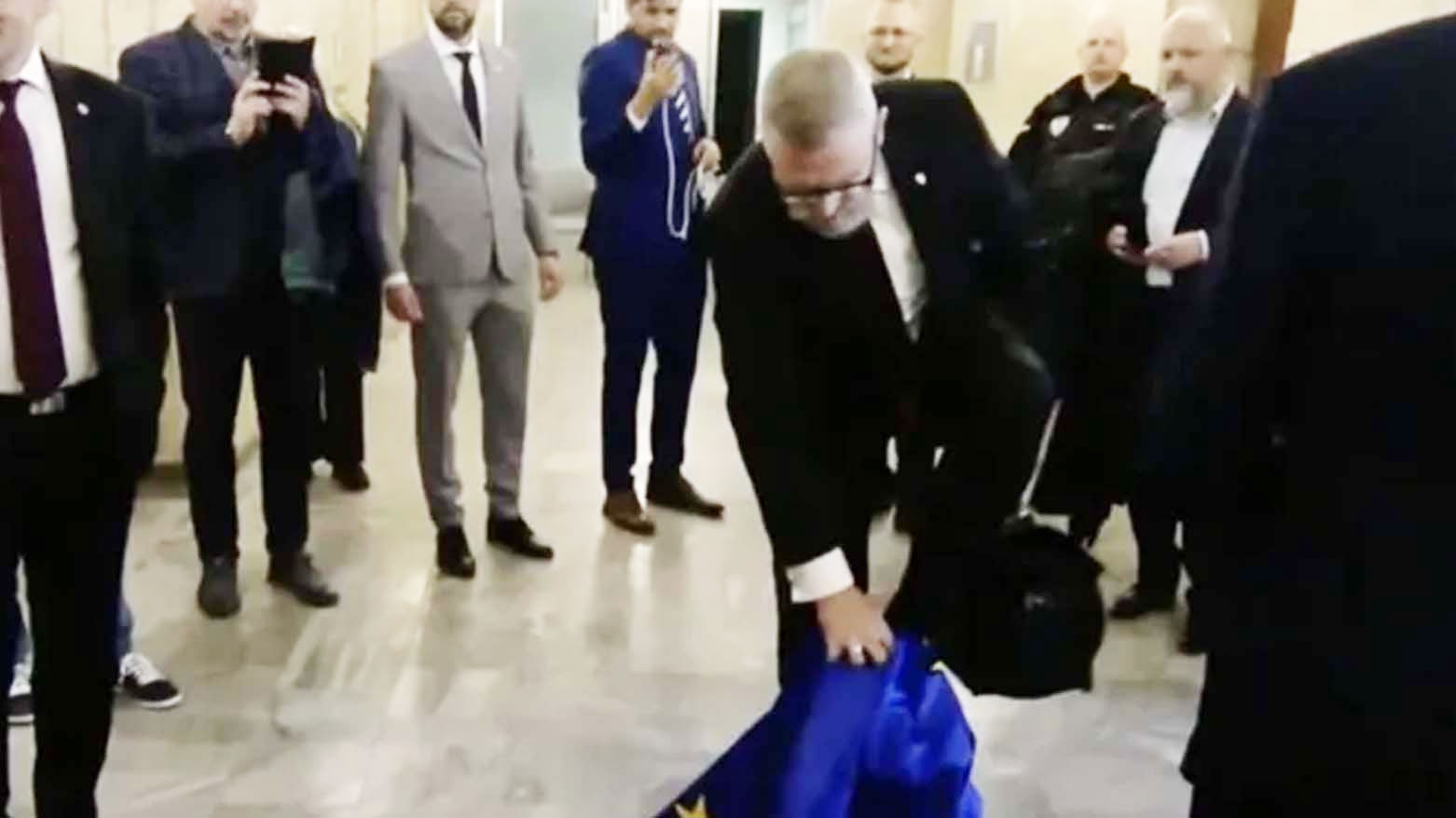 المرشح الرئاسي البولندي غريغورز براون يمسح حذاءه بعلم الاتحاد الأوروبي ثم يحرقه