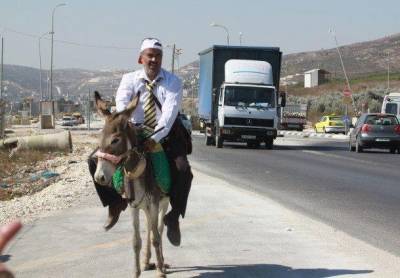صحفي فلسطيني يعتلي حماراً احتجاجاً على رفع المحروقات