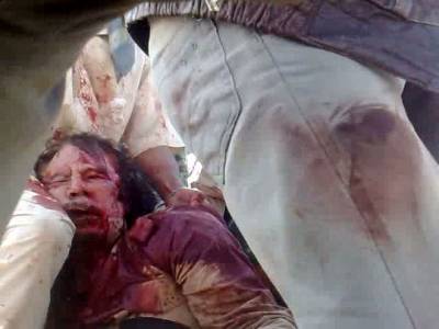 وحشية الثوار الليبيون في التعامل مع القذافي في الساعات الاخيرة قبل موته .. فيديو