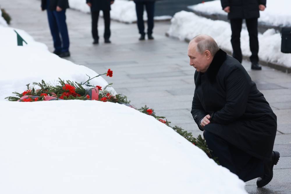بوتين يجثو على ركبته ويضع الزهور على ضريح جماعي يضم جثمان أخيه (صورة)