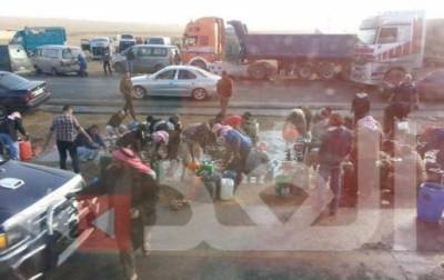 مواطنون يعبئون ما انسكب من صهريج نفط بعد انقلابه على الطريق الصحراوي