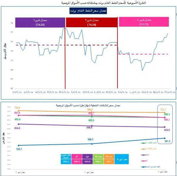 انخفاض برنت وارتفاع المشتقات النفطية في شهر آب