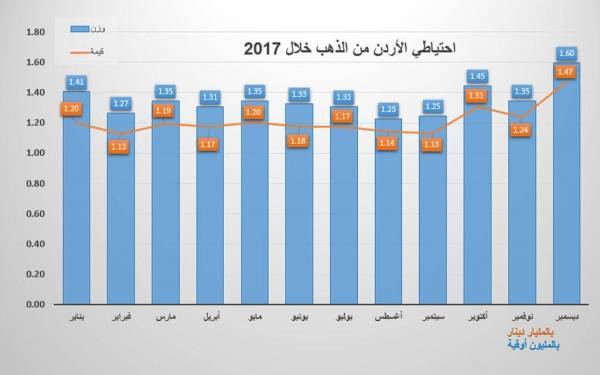 احتياطي الأردن من الذهب يرتفع للعام الرابع على التوالي