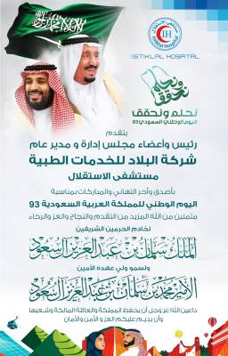 مستشفى الاستقلال يهنئ ويبارك بمناسبة اليوم الوطني للمملكة العربية السعودية 93