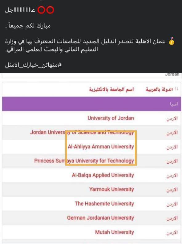 عمان الاهلية بصدارة الدليل الجديد للجامعات الاردنية المعترف بها في العراق