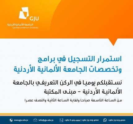 استمرار استقبال طلبات الالتحاق بتخصصات الجامعة الألمانية الأردنية