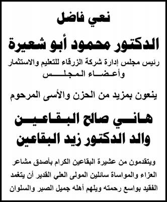 جامعة الزرقاء تنعى والد الدكتور زيد البقاعين