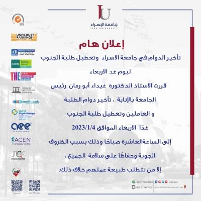 تأخير الدوام في جامعة الاسراء ليوم غد الاربعاء وتعطيل طلبة الجنوب