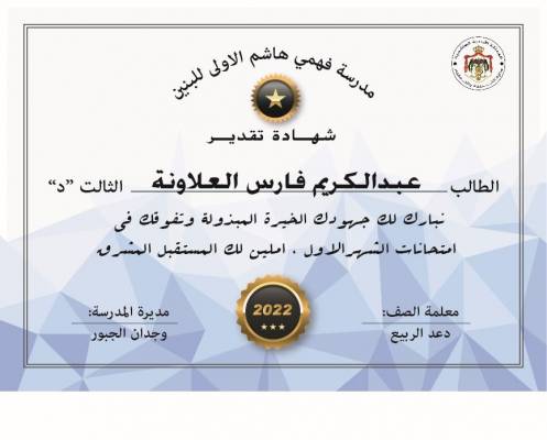 مدرسة فهمي هاشم الفترة الأولى تكرم الطالب عبد الكريم العلاونة