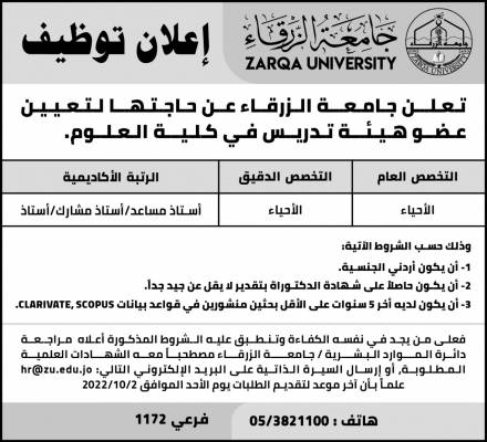 تـعـلــن جـامـعــة الـزرقــاء عـن حـاجـتـهــا لـتـعـيـيـن عـضـو هـيـئــة تـدريــس فـي كـلـيــة الـعـلــوم