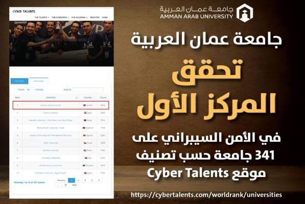 جامعة عمان العربية تحقق المركز الأول في الأمن السيبراني على 341 جامعة حسب تصنيف موقع Cyber Talents