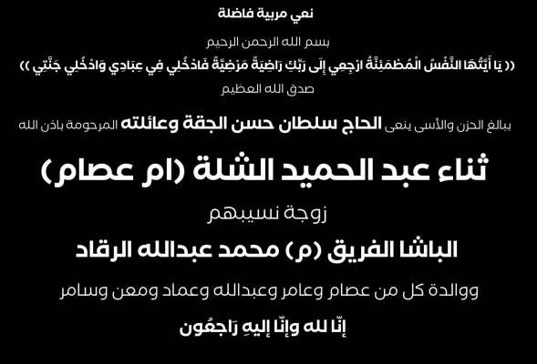 الفاضلة ثناء الشلة "ام عصام الرقاد" في ذمة الله