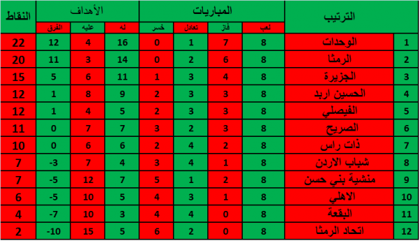 بعد فوزه على الفيصلي الوحدات متربعا على عرش الصدارة...جدول الترتيب بعد نهاية الجولة الثامنة