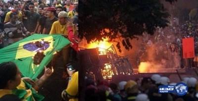 جماهير البرازيل تشعل النيران في الشوارع وعلم بلادها بسبب الخسارة من ألمانيا