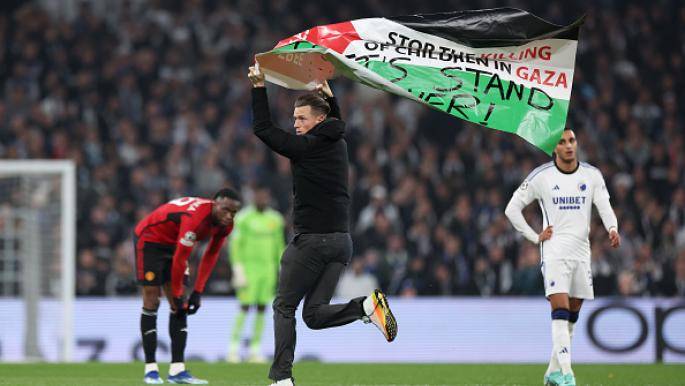 مشجع يرفع علم فلسطين في ملعب مباراة كوبنهاغن ومانشستر يونايتد بدوري الأبطال