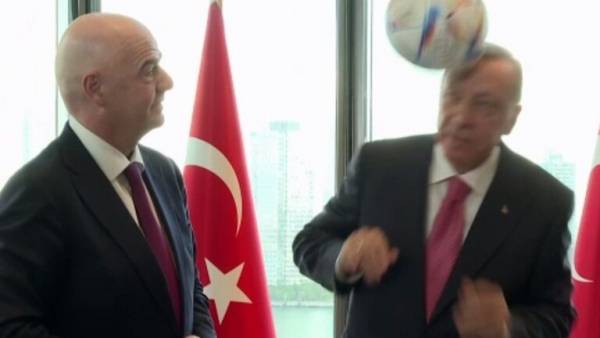 شاهد.. تسديدة رأسية مفاجئة من أردوغان أثناء تقديم كرة مونديال قطر 2022