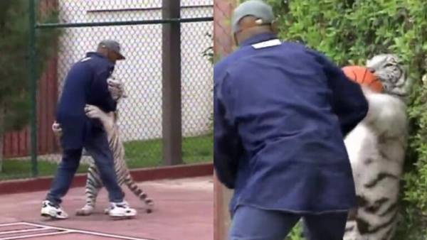 شاهد.. أسطورة الملاكمة تايسون الشاب يصارع نمرا !