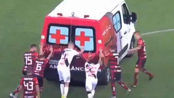 شاهد.. لاعبون يدفعون سيارة إسعاف تعطلت أثناء المباراة