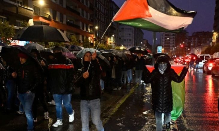 رغم الأمطار الشديدة والبرد القارس.. مظاهرة حاشدة ضد فريق “مكابي تل أبيب” لكرة السلة شمال إسبانيا- (صور وفيديو)
