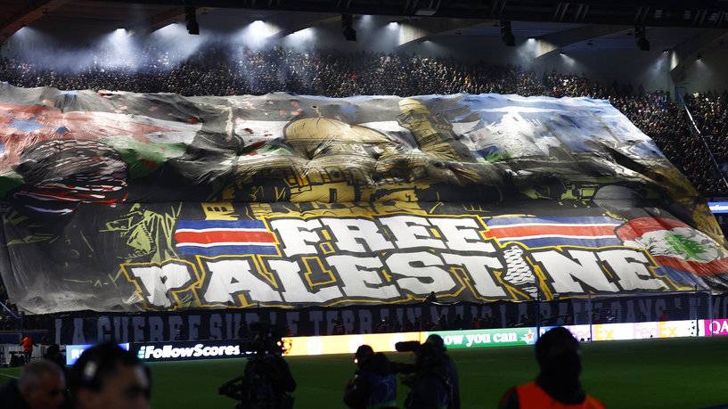 لافتة لجماهير سان جيرمان الفرنسي كتب عليها "فلسطين حرة"