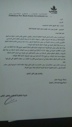 كتاب الإفصاح الصادر عن مجلس الإدارة الحالي للشركة حول إعداد القوائم المالية لغاية 30/6/2017 ،حيث تخاطب هيئة الأوراق المالية ، تلقت "أخبار البلد" نسخة منه،يكشف مستور الشركة نتيجة لعدم استلام المجلس الجديد والذي أنتخب اعتبارا من تاريخ 29/4/2017،كافة المعززات والقيود والمرفقات المالية،كما لم يستلم المجلس النظام المالي المحاسبي الإلكتروني الخاص بحسابات الشركة من المجلس السابق.