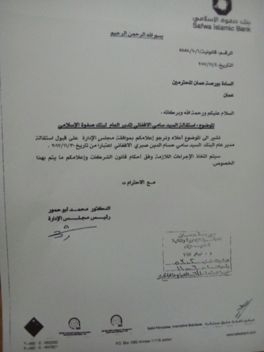 إشارة إلى الموضوع أعلاه نرجو إعلامكم بأن مجلس الإدارة قد قرر في اجتماعه العاشر المنعقد بتاريخ 4/11/2-17/تعيين اغلسيد سامر سعدي الصاحب التميمي مدير عام لبنك صفوة الإسلامي اعتبارا من تااريخ 1/3/2018.