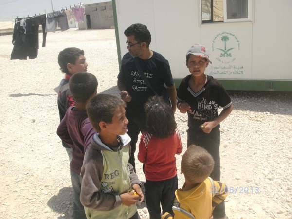 محمود صدقة، ومنذ عامين على اندلاع الازمة السورية، يستقبل يومه واشراقة الشمال المفرقاوي على سماء الزعتري، بوجوه ملائكية تنتظره كما تنتظر الارض الجرداء المطر، ينتظرونه كأبٍ وأخٍ وصديق وطفل لا يبتعد عن أعمارهم فيما هو يلهو معهم ويُحضر لهم الفرح على شكل دمية بأطرافٍ كاملة، فقد ارتعبت مخيلة الصغار بالايدي المبتورة والاقدام المسحوقة تحت الة التخريب ..