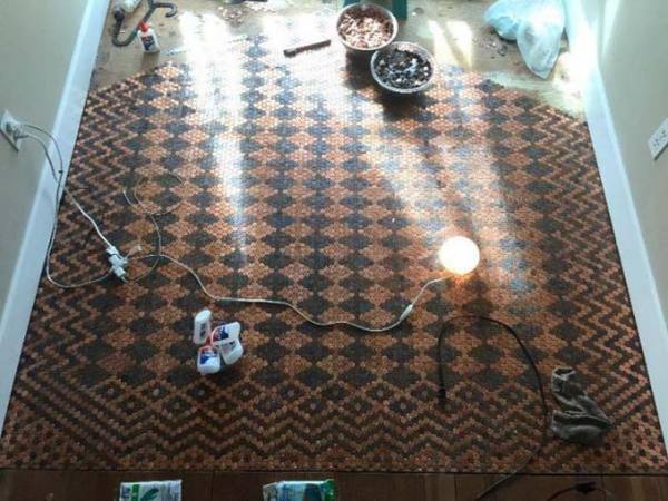 ونيا فنانة من بورتلاند الأميركية تحب البناء والتجديد في المنزل قامت مؤخرا بتجديد طابق قديم بأكثر من 13،000 قطعة نقدية وقد استهلكت اكثر من 10 زجاجات من الغراء استغرق الأمر بضعة أشهر لاستكماله .