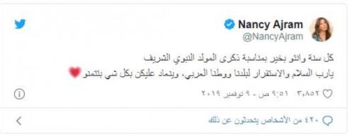 نشرت الفنانة نانسي عجرم تهنئة بمناسبة ذكرى المولد النبوي الشريف عبر حسابها عبر التويتر، وتمنت الخير والسلام والاستقرار لبلدها لبنان ولجميع بلدان الوطن العربي.
