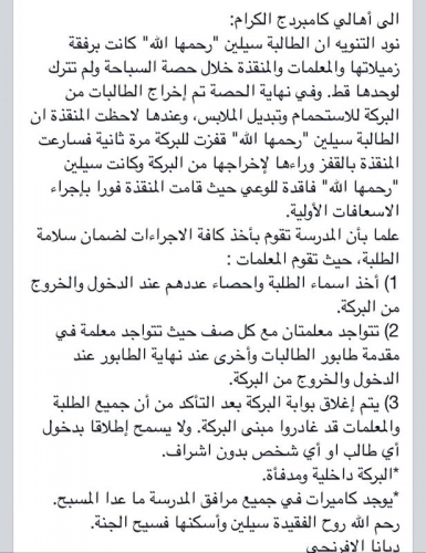 زميلاتها ومعلماتها والمنقذة خلال الحصة السباحة ولم تترك وحدها قط .